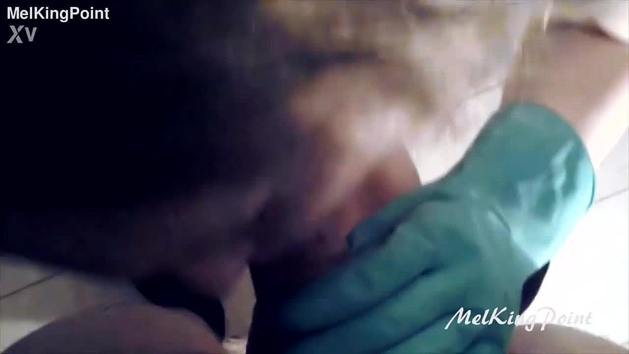 Blonde Milf Sucking Cock with Plastic Gloves in Latex Outfit